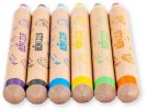- Drewniane kredki z drewna lipowego posiadają okrągły kształt oraz zostały odpowiednio wyważone, dzięki temu idealnie dopasowują się do małej dłoni dziecka. Dzięki temu, że są grubsze ( grubość grafitu 8 mm) bardzo dobrze sprawdzą się dla mniejszych dzieci, które mogą łapać kredkę całą dłonią.