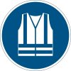Znak bezpieczeństwa BHP samoprzylepny podłogowy okrągły z symbolem STOSUJ KAMIZELKĘ OCHRONNĄ do oznaczenia ciągów komunikacyjnych.