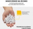 - Niszczy dokumenty na ścinki wraz ze zszywkami i małymi spinaczami, a także tnie karty kredytowe i płyty CD/DVD.
