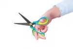 - Ergonomiczny uchwyt z umieszczoną na nim buźką, która wskazuje prawidłowe ułożenie nożyczek w dłoni.